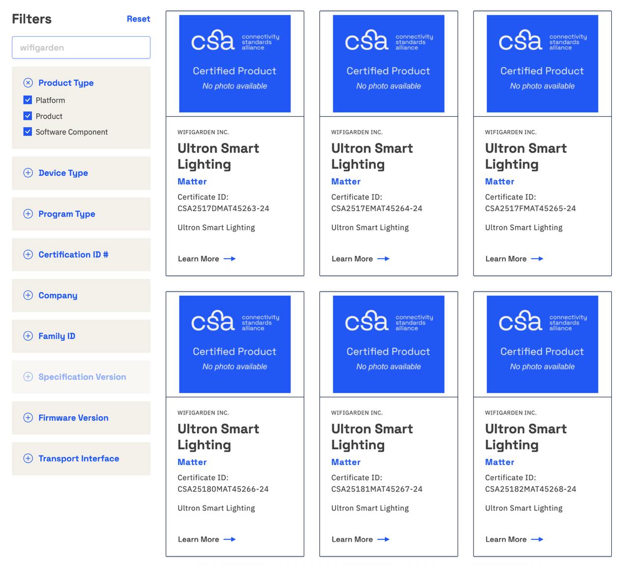 由 UltronSMART Inc. 開發的多款 Ultron 智慧照明產品,近期已順利取得 Connectivity Standards Alliance(CSA) 頒發的 Matter 認證(詳見上圖)。這些認證不僅展現 ULTRON 自有產品在標準化整合上的實力,更實際驗證了我們從產品開發、測試到最終提交認證的全流程經驗。